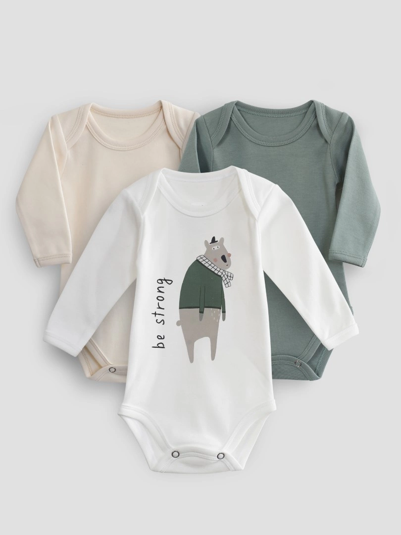 Набор из трёх боди с длинным рукавом — идеальный выбор для комфортных и стильных будней малыша. Главный акцент на молочном боди с очаровательным принтом: обаятельный Медведь в скандинавском стиле и мотивирующая надпись "Будь сильным" добавляют вдохновения и уютной атмосферы в каждый день. В комплект также входят два однотонных боди в универсальных цветах – Сливки и Полынь. Мягкая ткань приятна к коже, а удобные кнопки позволяют легко сменить одежду.