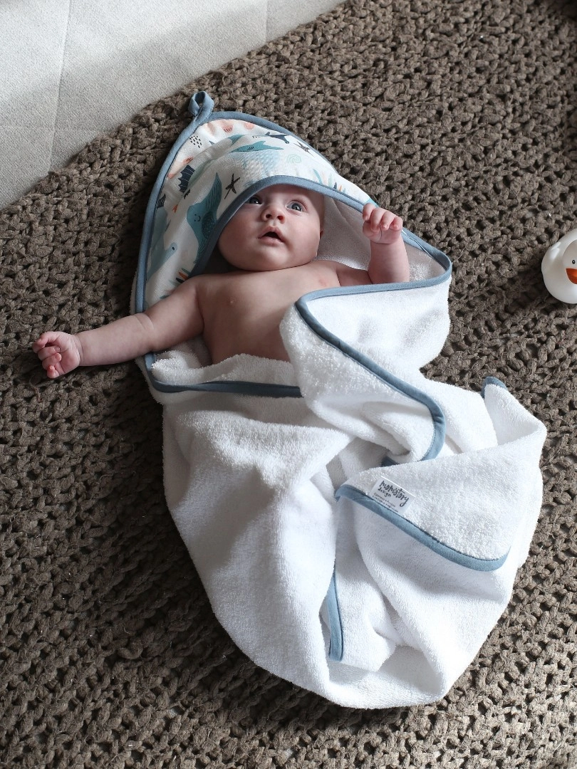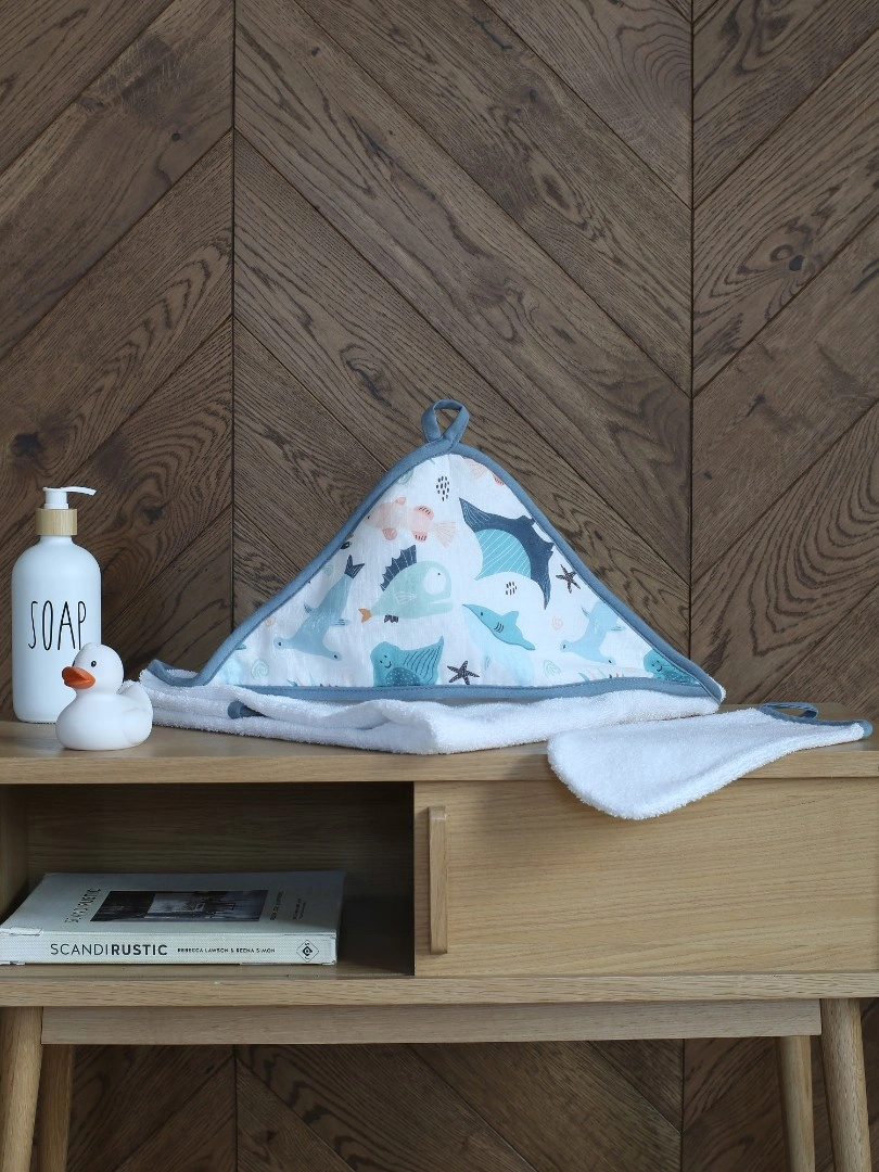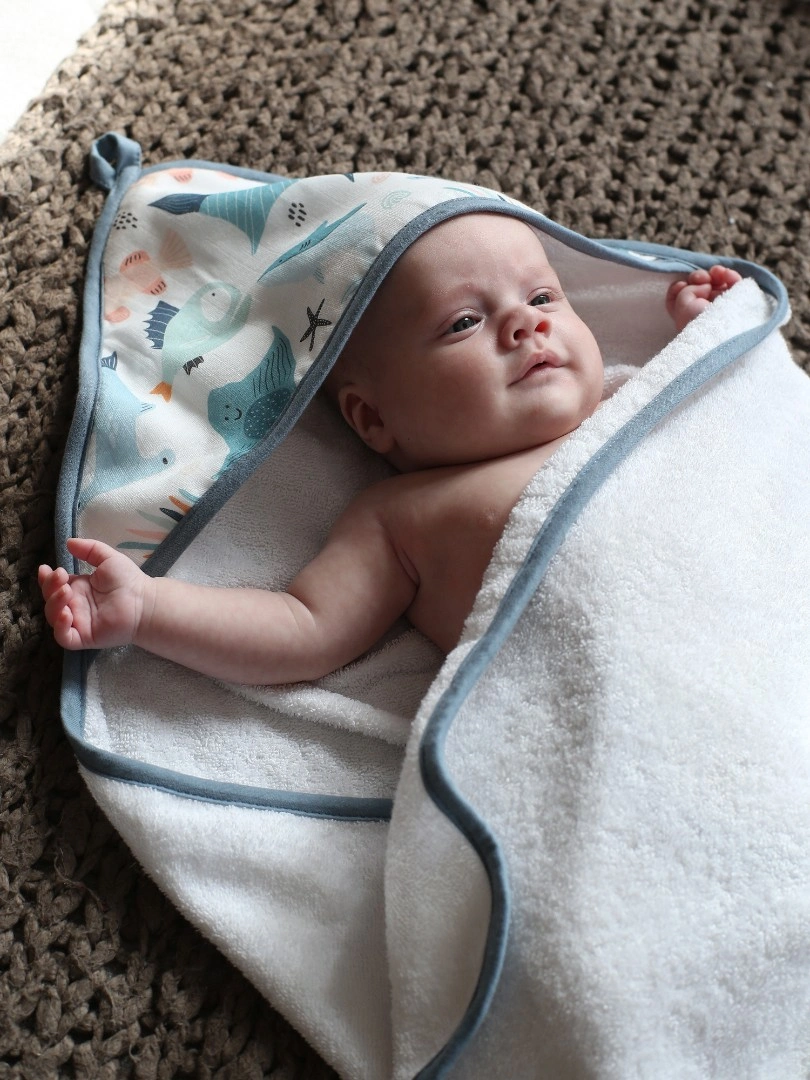Полотенце для новорожденных с уголком из муслина — это не просто аксессуар, а настоящий must-have для заботливых мам, который сделает купание новорожденного комфортным и приятным. Принт "Океан" с яркими разноцветными рыбками — уникальный и дизайнерский, что делает ваше полотенце неповторимым. Оно изготовлено из премиум махры, которая очень мягкая и приятная на ощупь, заботится о нежной коже малыша после первого купания новорожденного.