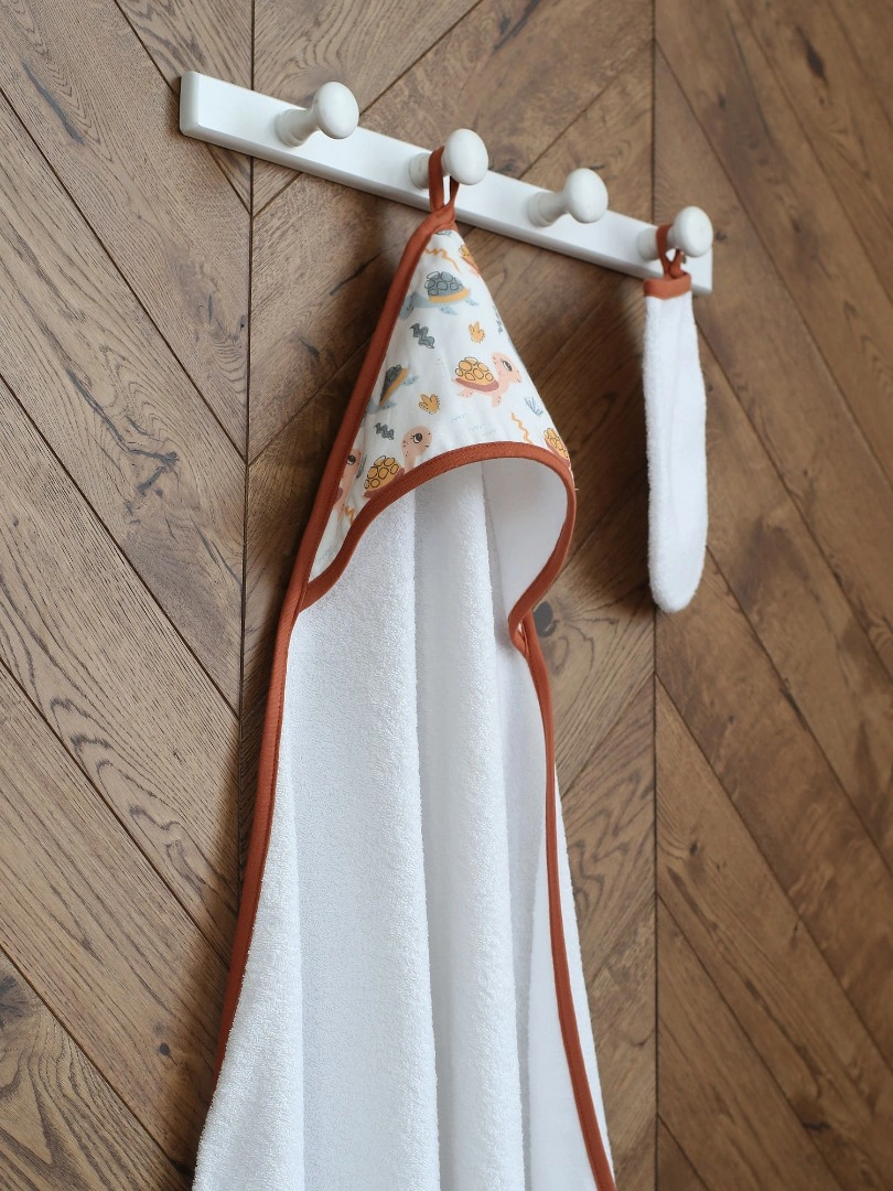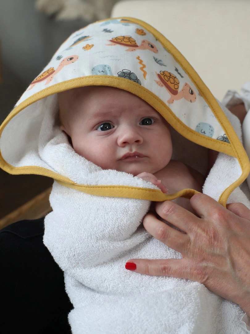 Полотенце для новорожденных с уголком из муслина — незаменимый помощник для мам, которые заботятся о комфорте своего малыша. Принт "Черепахи" с яркими и дружелюбными изображениями делает это полотенце не только практичным, но и веселым, создавая атмосферу уюта после первого купания новорожденного. Цвет канта — охра — добавляет стильный акцент, делая полотенце еще более привлекательным.