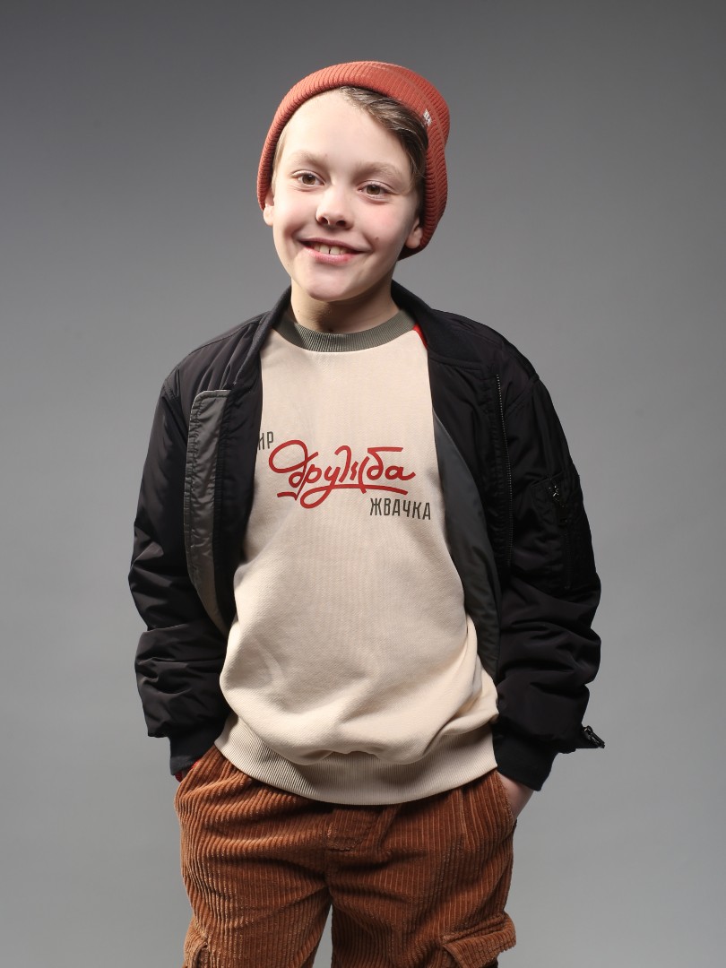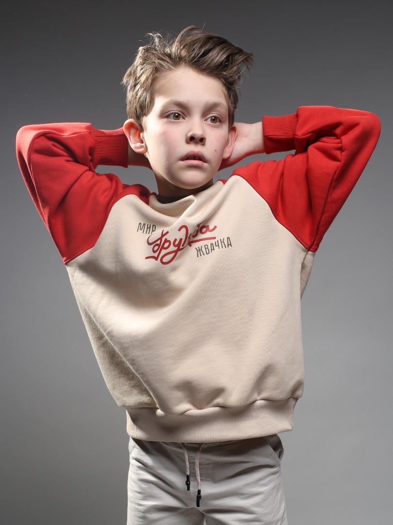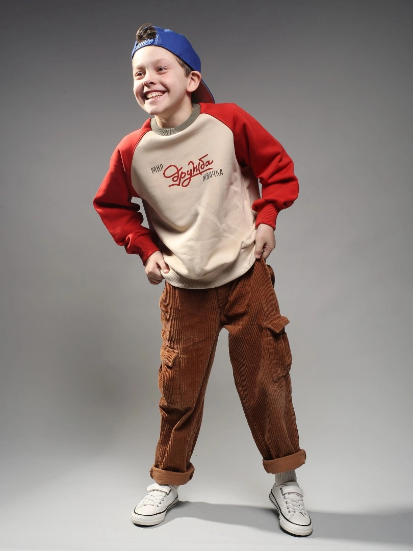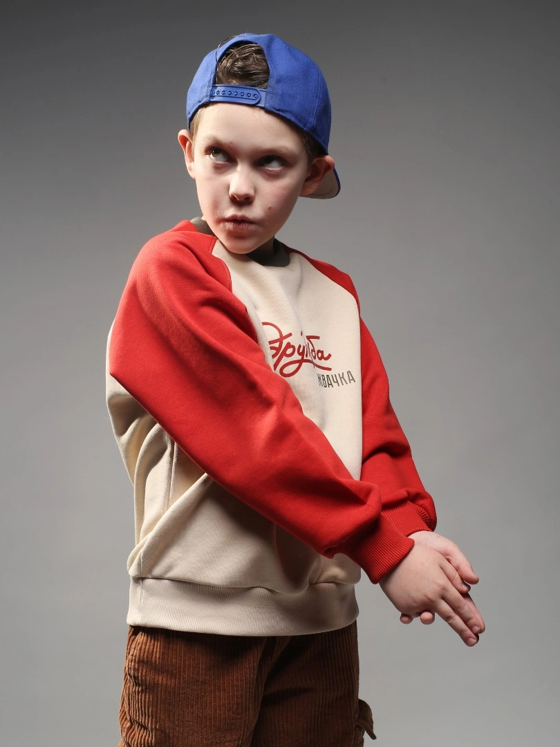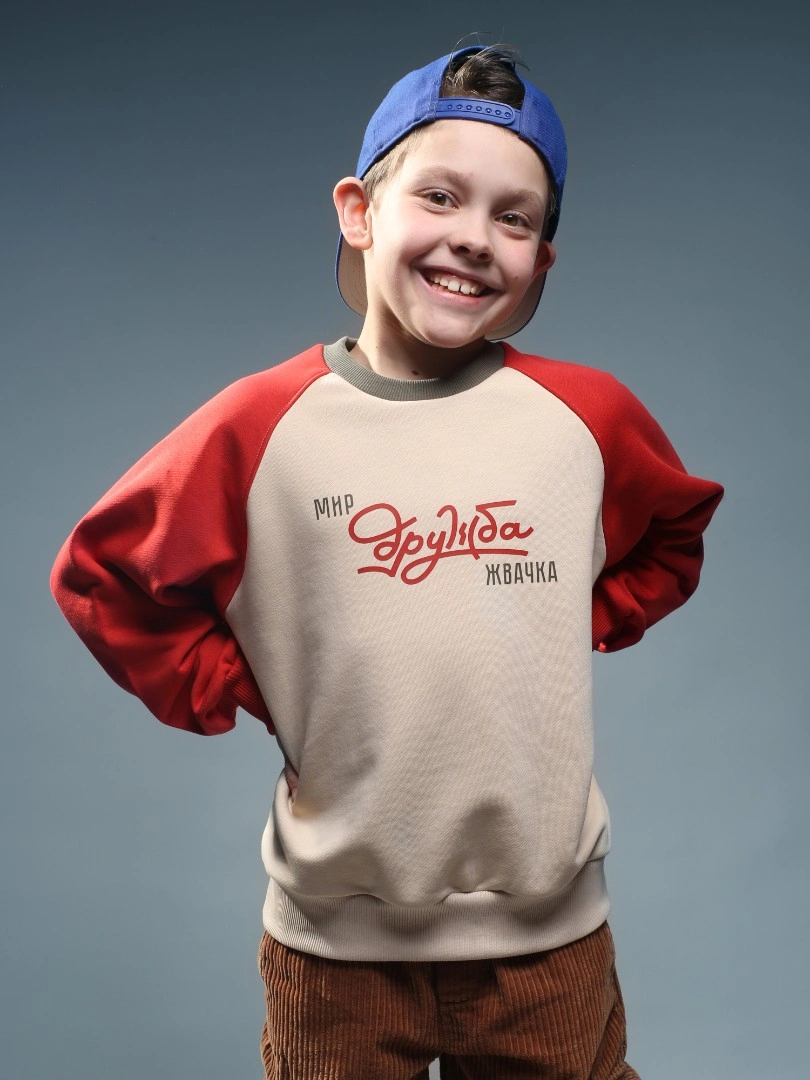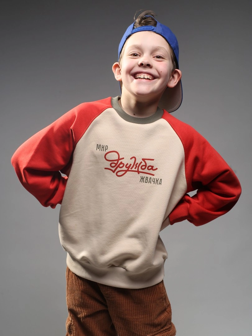 Легендарная фраза, ставшая символом детства. Идеально подходит для малышей, которым важно понимать, что дружба и мир — это то, что делает мир ярким и позитивным. Свитшот выполнен из мягкого бежевого футера с рукавами реглан красного цвета и воротником под цвет принта. Это не просто одежда, а послание: о дружбе, о том, как важно мириться и ценить друг друга. Стильный, удобный и с глубоким смыслом — для самых маленьких и любимых.
