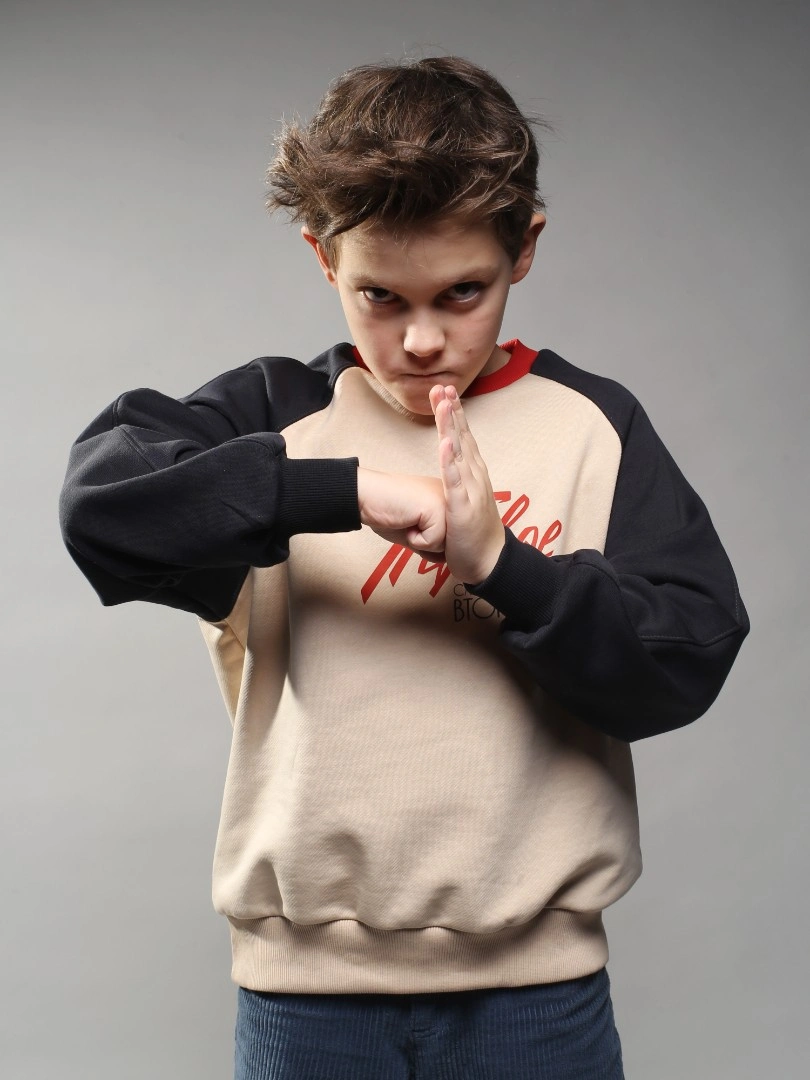Мы все знаем, как важны первые слова малыша. Но это не только про радость от произнесенного звука, но и о том, что каждое слово имеет значение. Свитшот с фразой «Первое слово дороже второго» напоминает детям о том, что то, что мы говорим, может обидеть или обогатить, и важно думать, прежде чем говорить. Графитовые рукава и воротник под цвет принта делают эту модель не только стильной, но и актуальной для тех, кто ценит правильное воспитание и учит детей бережно относиться к словам.