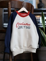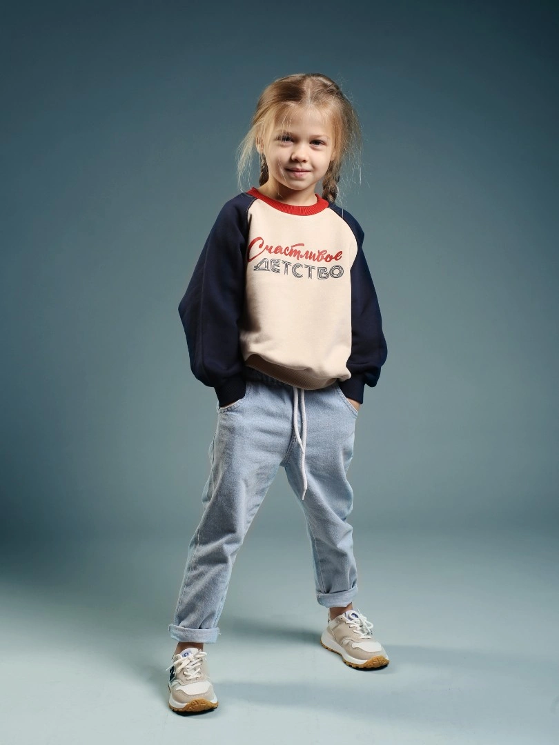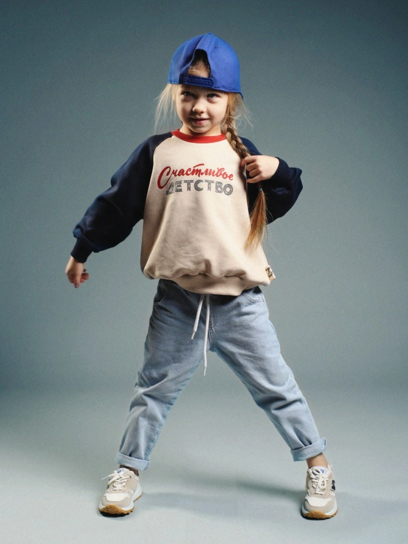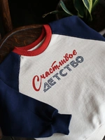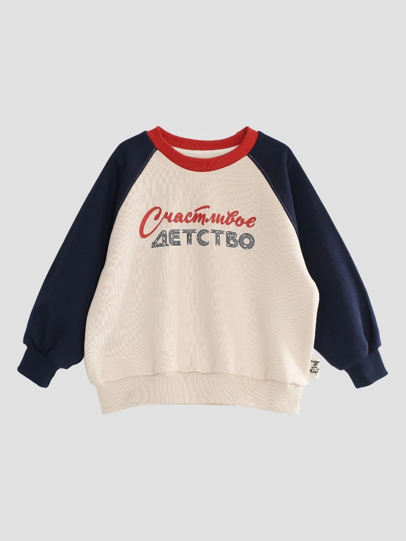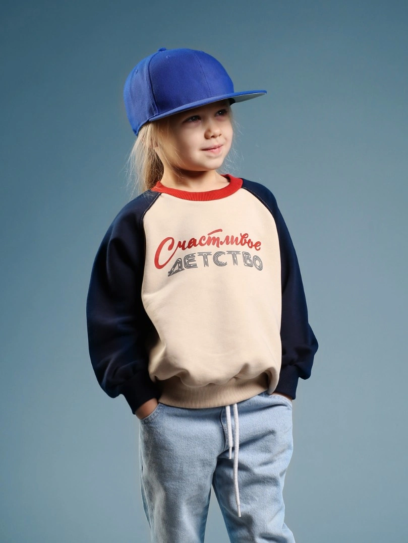 Для тех, кто помнит, как здорово было быть ребёнком, не думая о проблемах и заботах. Свитшот с принтом «Счастливое детство» - это ностальгия по беззаботным моментам и простым радостям жизни. Темно-синие рукава реглан и воротник под цвет принта прекрасно гармонируют с бежевым футером, создавая уютный и стильный образ для вашего малыша. Подарите ребенку кусочек радости и беззаботности с этим свитшотом, который будто бы возвращает в те самые моменты, когда счастье было простым и искренним.