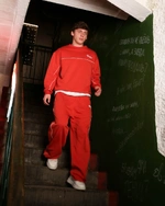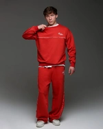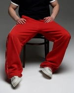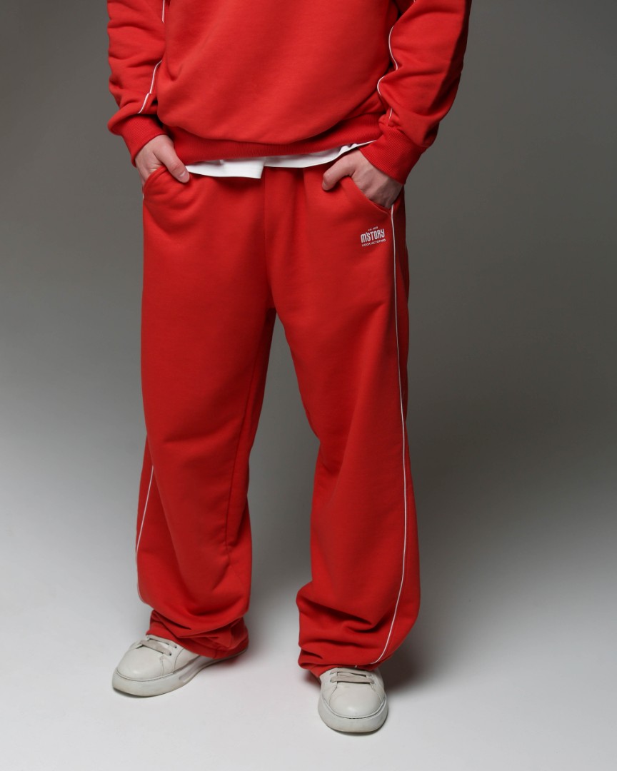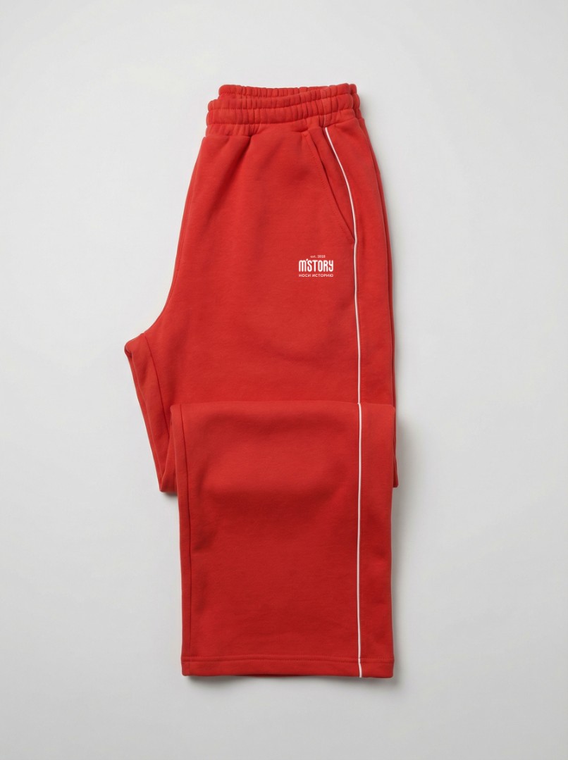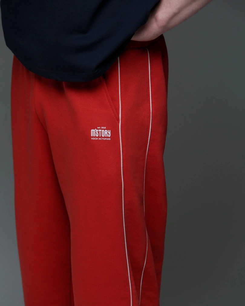 Из плотного футера 3х нитки. Красные, с белым тонким кантом по бокам вместо широких лампасов. Сдержанно, но с ярким характером. Удобный прямой крой, карманы.