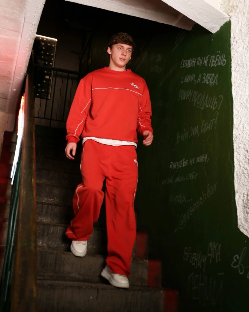 Свитшот и брюки из одной ткани — готовый костюм в стиле советского спортивного шика. Носите вместе или по отдельности, в городе или за его пределами. Для тех, кто ценит тепло, качество и неустаревающую эстетику.