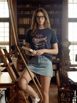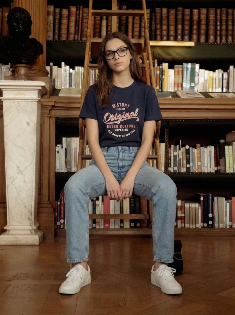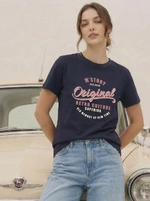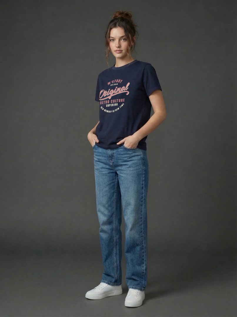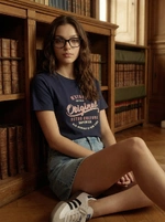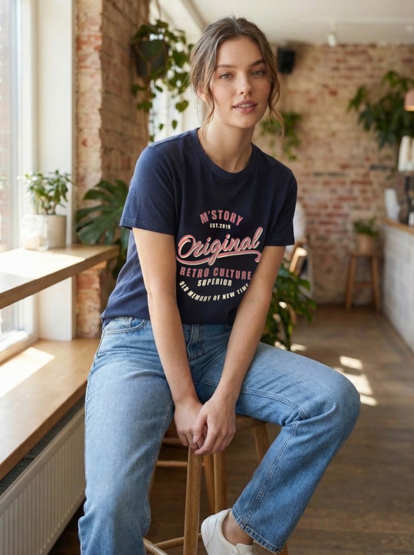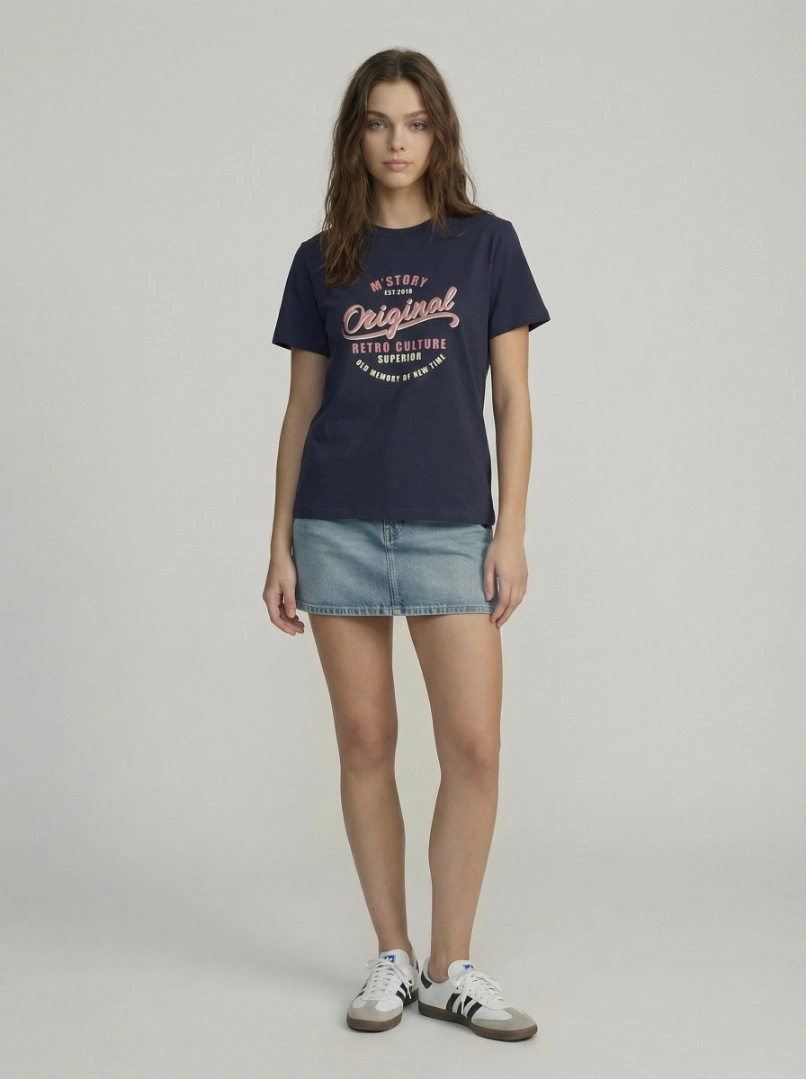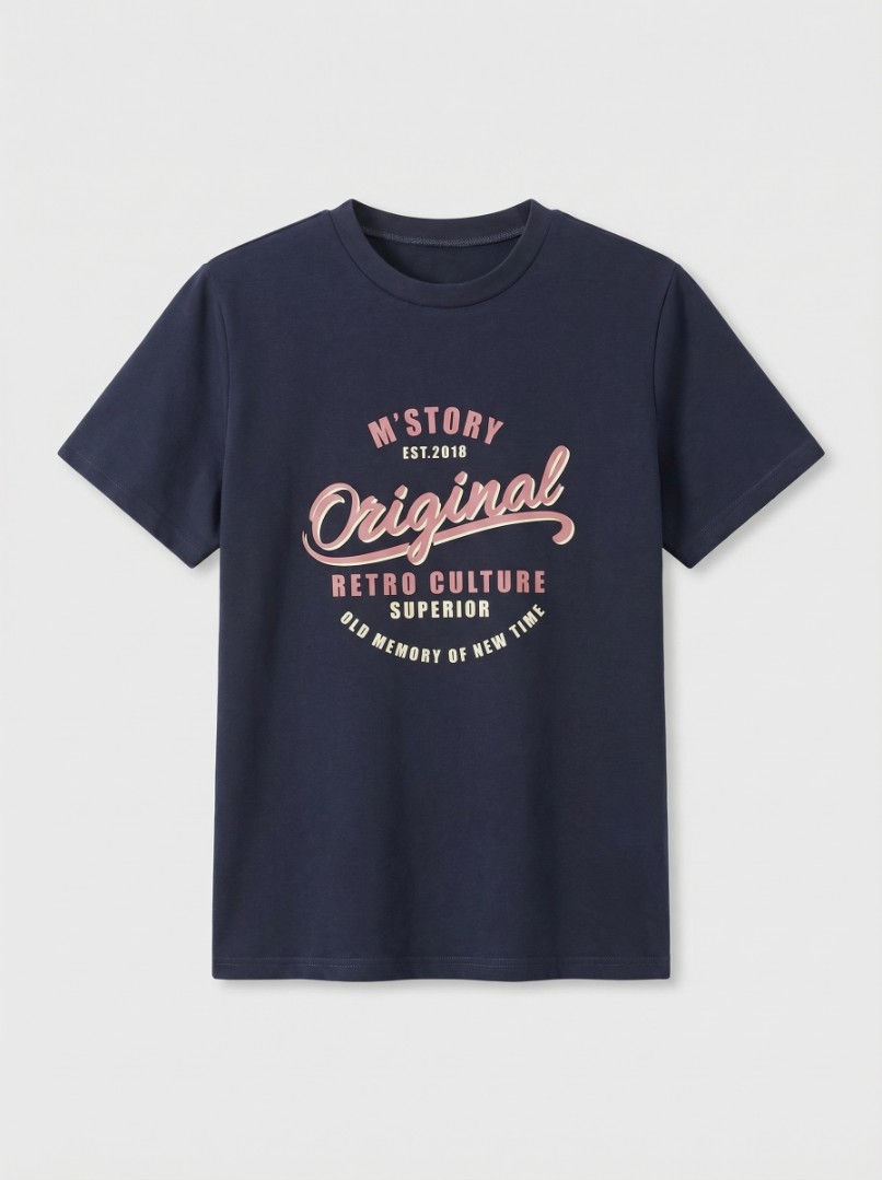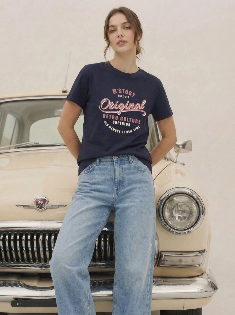 Тёмно-синяя основа и яркий розовый принт «Original retro culture» — сочетание, которое работает на контрасте. Принт выполнен в винтажной графике, отсылающей к эстетике культовых надписей прошлого.