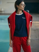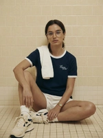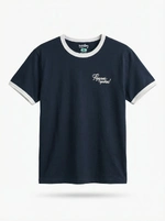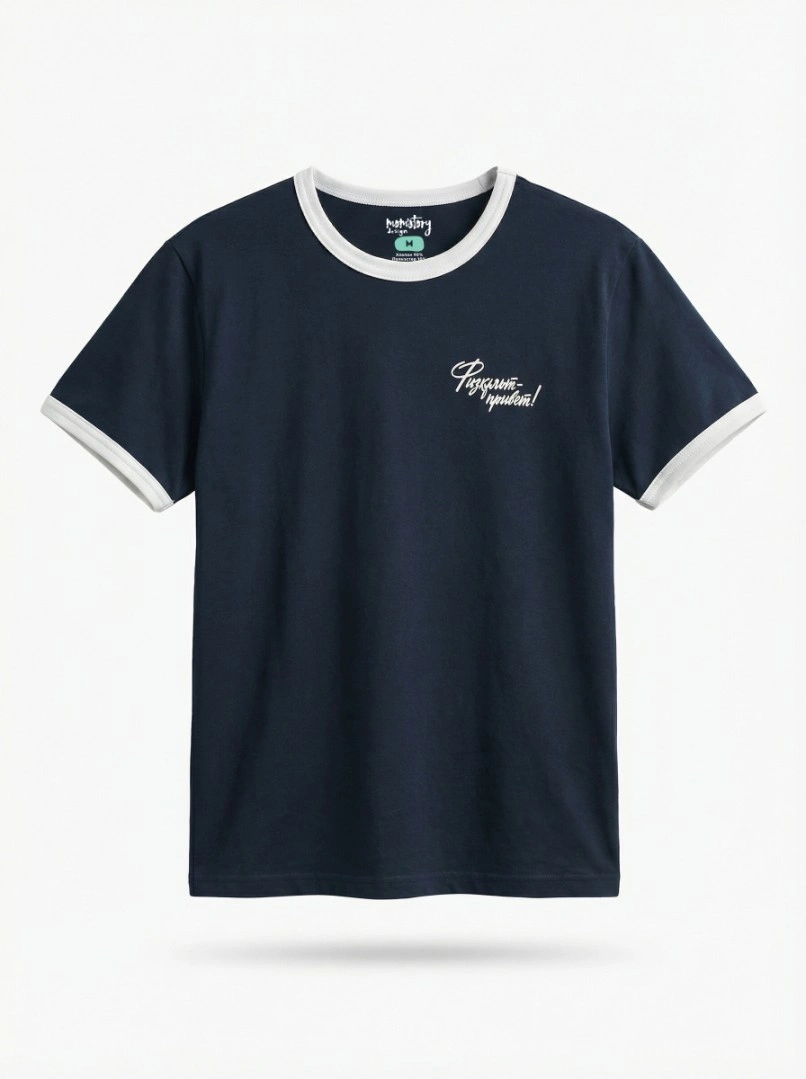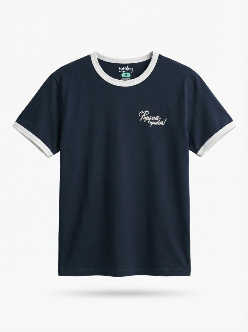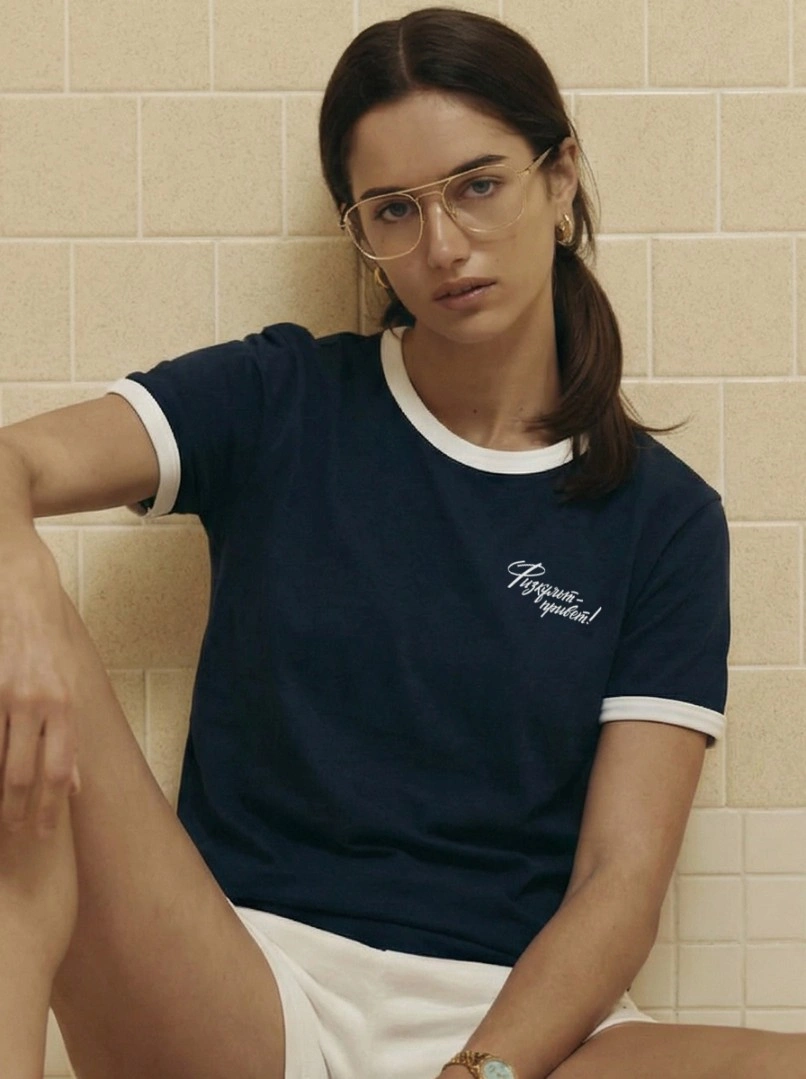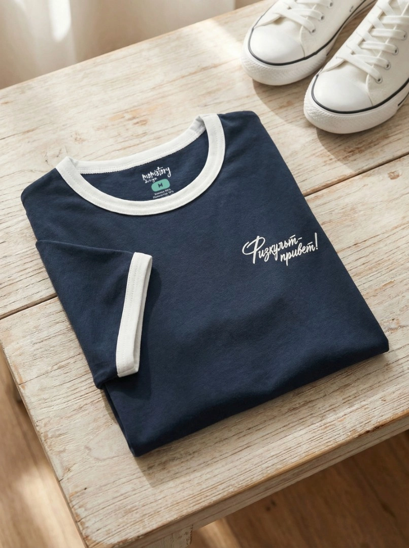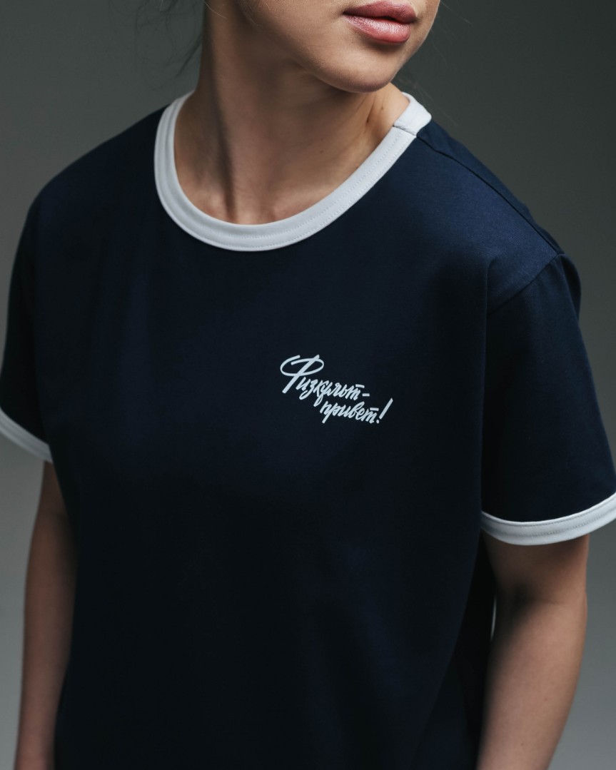 Тёмно-синяя футболка с молочной окантовкой — дань советской физкультурной эстетике, где бодрость и активность были нормой. Принт «Физкульт-привет!» слева на груди — не просто ностальгия, а напоминание о том, что забота о себе, движение и тонус могут быть частью повседневного стиля.