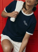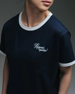 Женская футболка «Физкульт-привет!» тёмно-синяя с молочным кантом