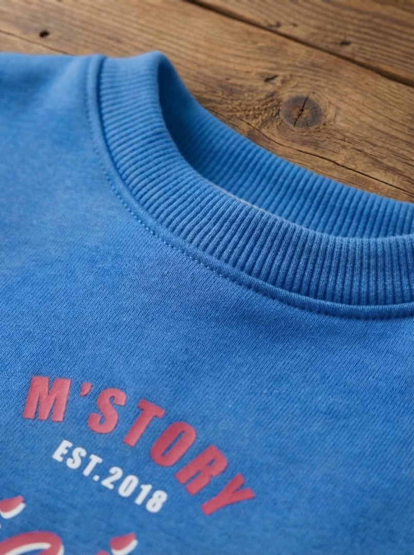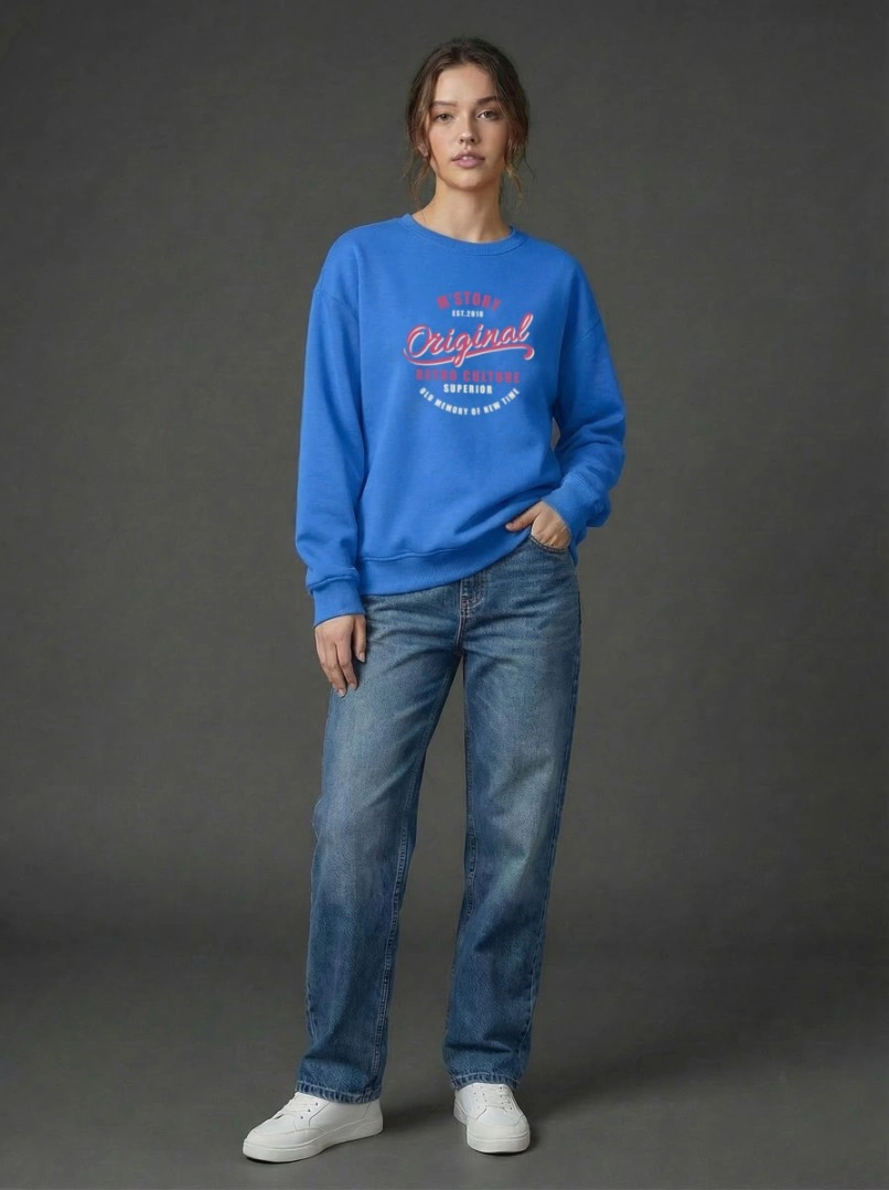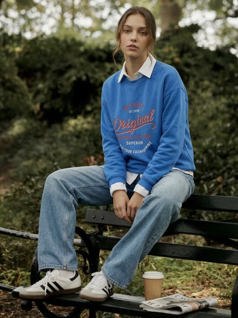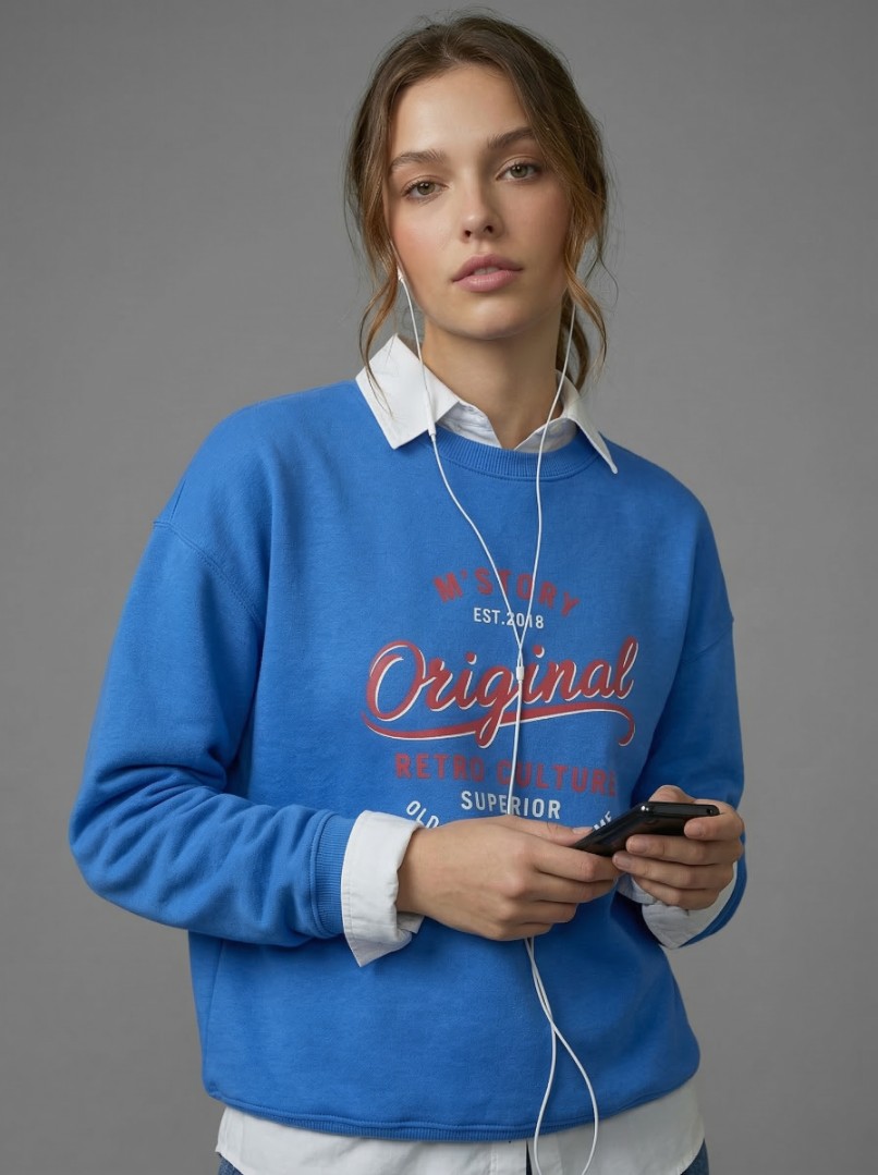 Насыщенный синий цвет и яркий ягодный оттенок принта — для уверенных в себе. Этот свитшот не останется незамеченным: он создаёт настроение и работает как самостоятельный акцент в образе.